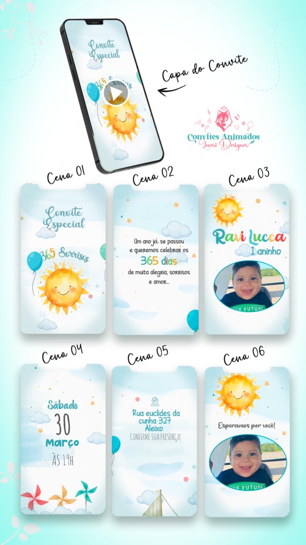 ✔️ Animação personalizada com nome, idade, data, local, horário e foto