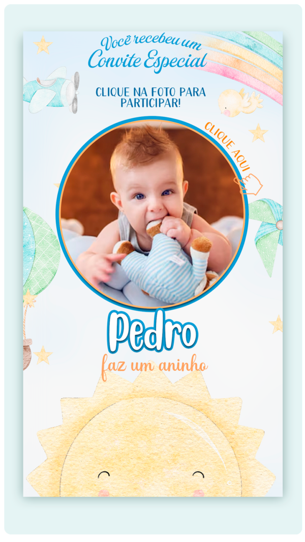 ✔️ Animação personalizada com nome, idade, data, local, horário e foto